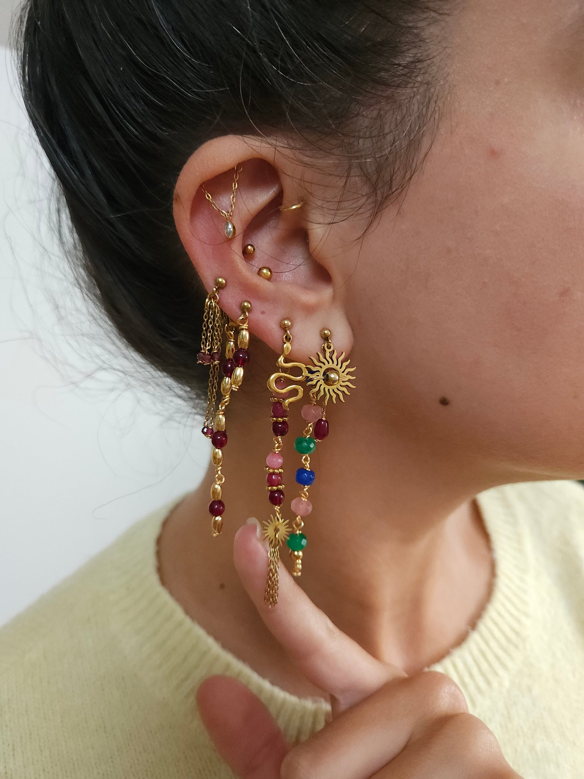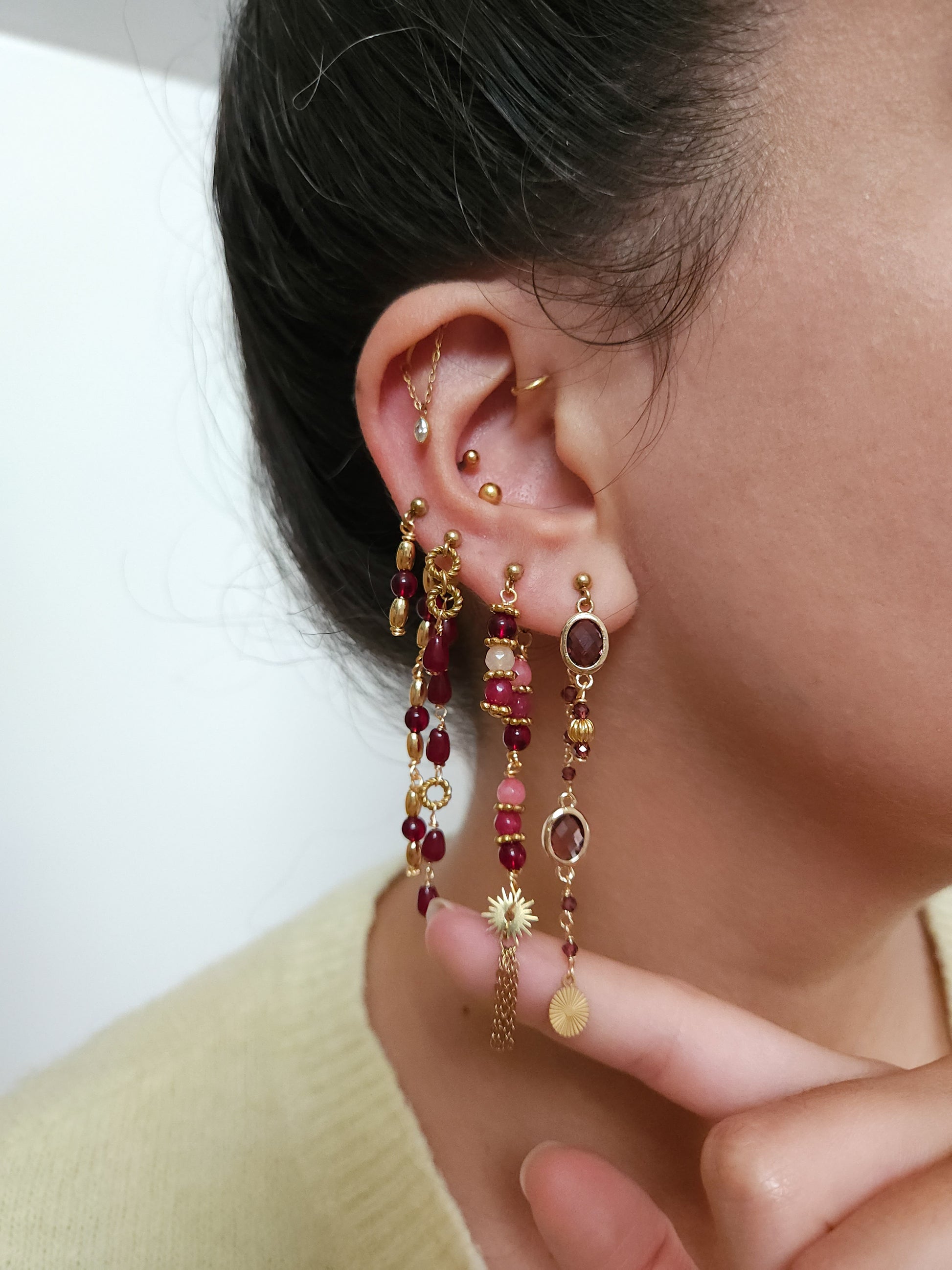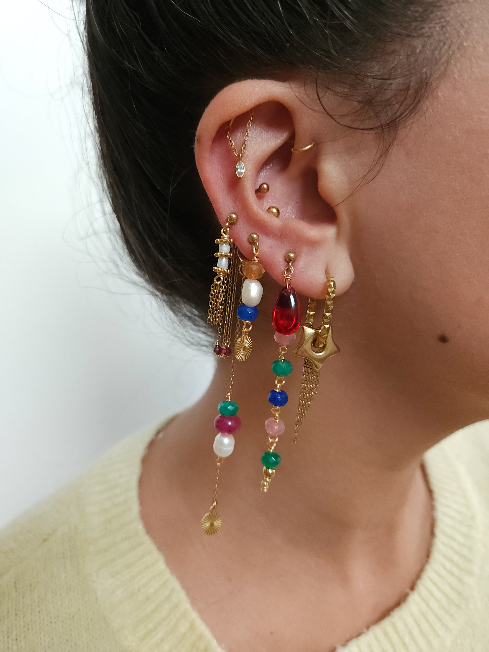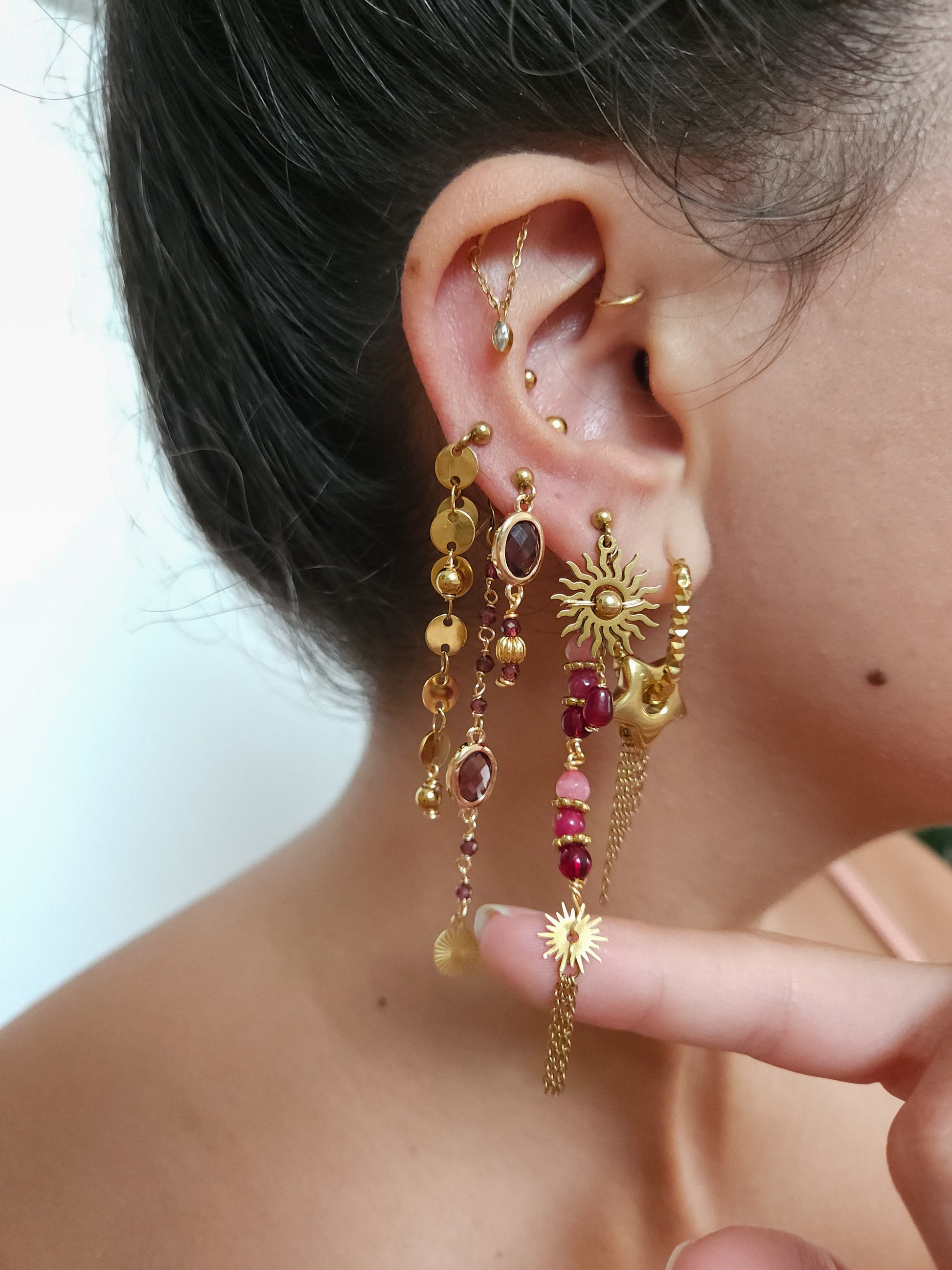 Boucles personnalisables a l’unité en acier et dorées à l'or fin, etoile lune, soleil perles rouges